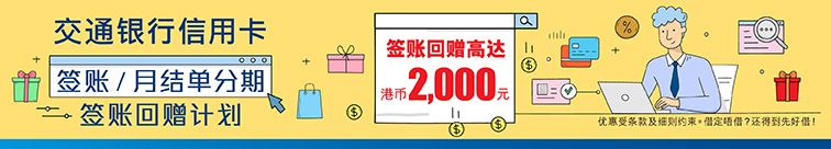 于推广期内,凭交通银行信用卡成功申请签账/月结单分期累积满指定分期金额,并选择指定还款期,可享高达港币2,000元签账回赠: