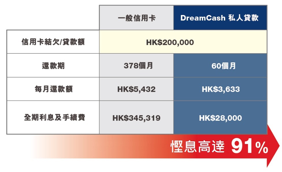 ^ 以贷款额/信用卡结欠HK$200,000为例,假设每月还款额为信用卡结单总结欠的4%或HK$50(以高者为准),以月息2.50%计算的首60个月平均每月还款额为$5,431.98,总还款期为378个月,全期利息$345,319.34,实际年利率为34.49%。如以DreamCash私人贷款清还卡数,以还款额60个月,每月平息0.15%及手续费为每年贷款额1%计算,实际年利率为5.69%,全期利息支出(包括手续费)为$27,999.80,省息高达91%。例子只供参考,实际可节省的总利息支出将按个别客户的信贷情况而定。